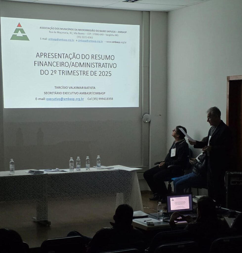 A reunião iniciou com o pronunciamento do Presidente da AMBASP/CIMBASP, Leonardo Vinhas Ciacci, Prefeito de Varginha, momento em que desejou uma produtiva reunião. Assumiu os trabalhos o Secretário Executivo Tarcísio Valkimar Batista fazendo apresentação da Prestação de Contas da AMBASP/CIMBASP do segundo trimestre de 2025, bem como o balancete trimestral e novos objetos de interesse comum dos municípios para realização de licitações compartilhadas, apreciação e posterior aprovação pela Assembleia Geral. Apresentação do Relatório das atividades desenvolvidas pela AMBASP e CIMBASP no segundo trimestre de 2025.