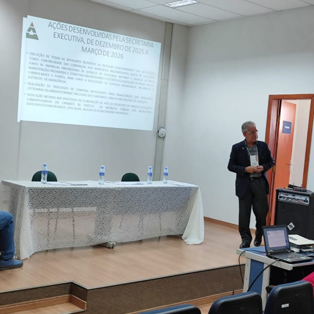 Em seguida o Secretário Executivo da AMBASP/CIMBASP, Tarcísio Valkimar Batista, apresentou o relatório das atividades desenvolvidas pela AMBASP e CIMBASP do 1º trimestre de 2026. Wadson Camargo, representante do prestador de serviços contábeis, realizou a prestação de contas da AMBASP do exercício de 2025 e primeiro trimestre de 2026, bem como, o parecer favorável do Conselho Fiscal.